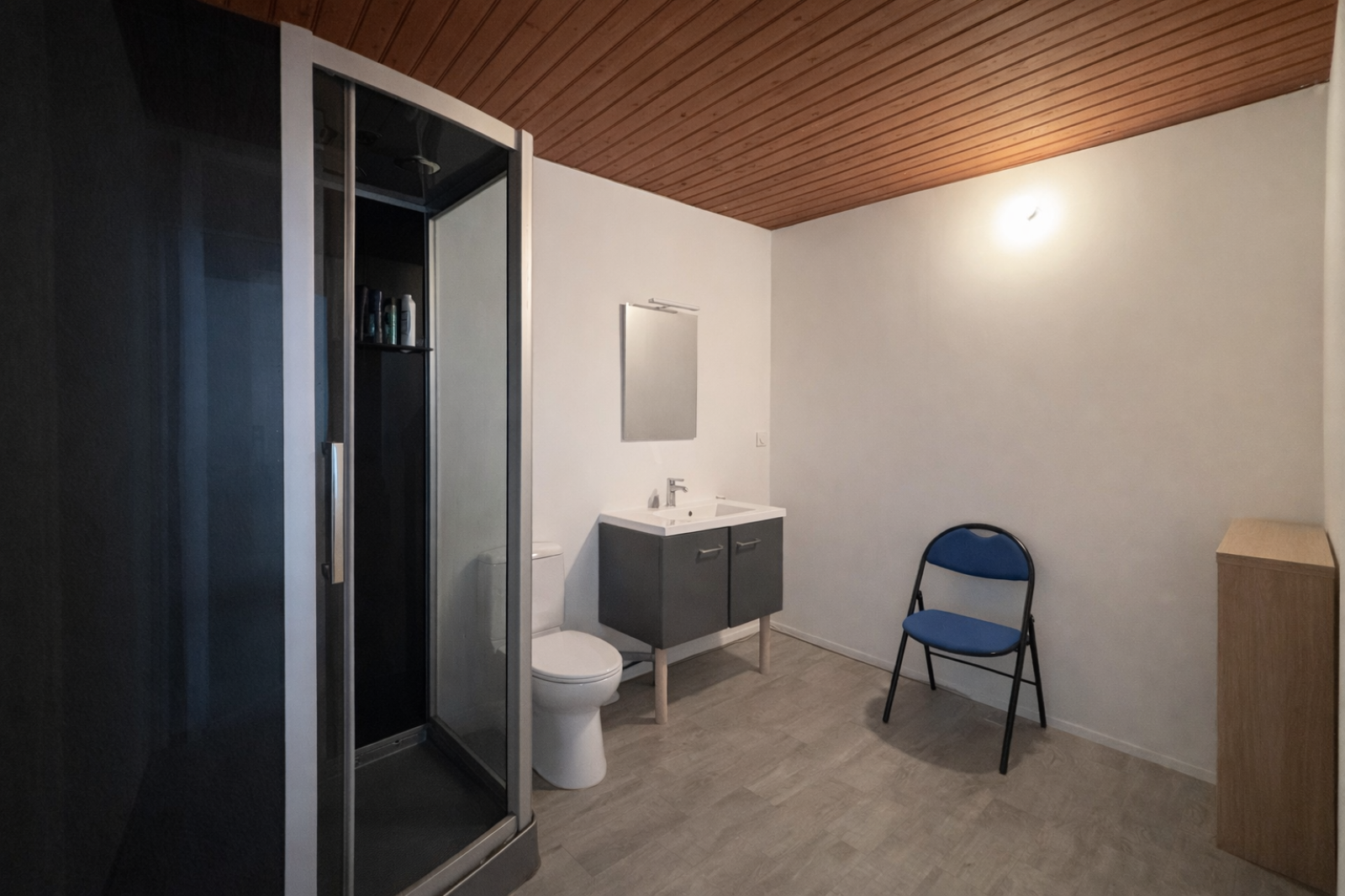 Le studio offre une surface habitable d’environ 30 m², optimisée pour une personne seule. Il s’ouvre sur une entrée donnant sur la chambre avec coin cuisine aménagé et placard, puis une salle d’eau équipée d’une douche, d’une vasque et d’un sanibroyeur.