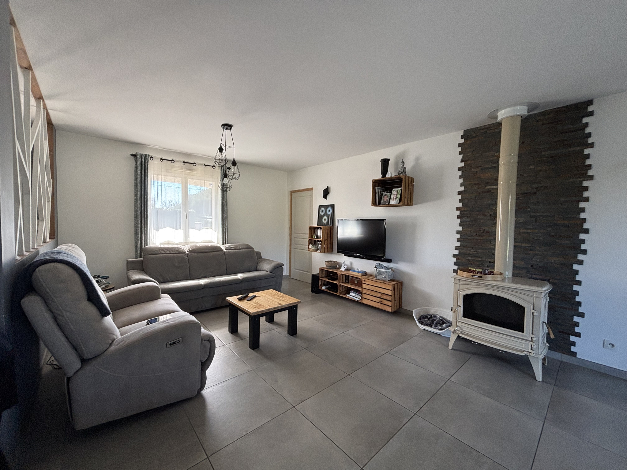 Depuis le séjour, un accès direct vous conduit à une grande terrasse, parfaite pour profiter des beaux jours, recevoir vos proches ou simplement savourer le calme environnant.