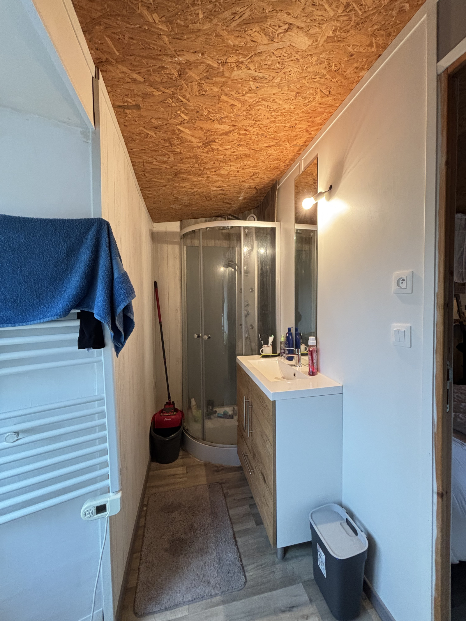 Au rez-de-chaussée, vous découvrirez une pièce de vie chaleureuse dotée d’une cheminée insert, une cuisine simple ainsi que des sanitaires. À l’étage, un palier lumineux dessert une chambre confortable et une salle d’eau avec douche et vasque.