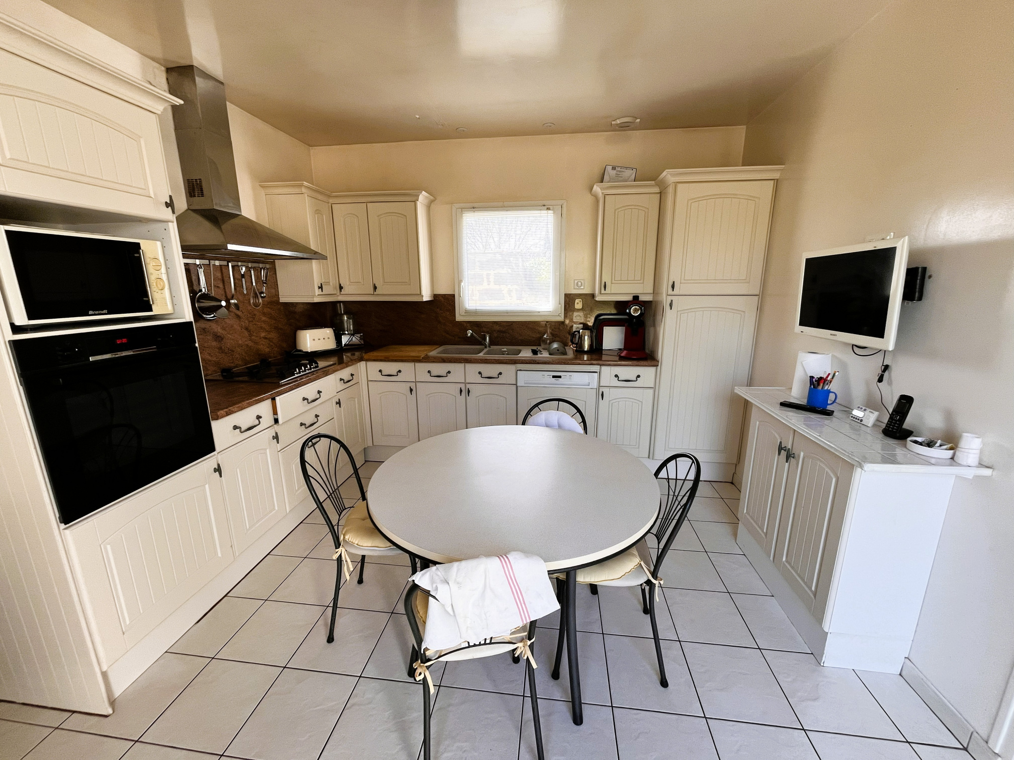 La cuisine indépendante, aménagée et équipée, s’ouvre également sur l’extérieur et se prolonge par une arrière-cuisine fonctionnelle, en lien direct avec un garage d’environ 40 m².
