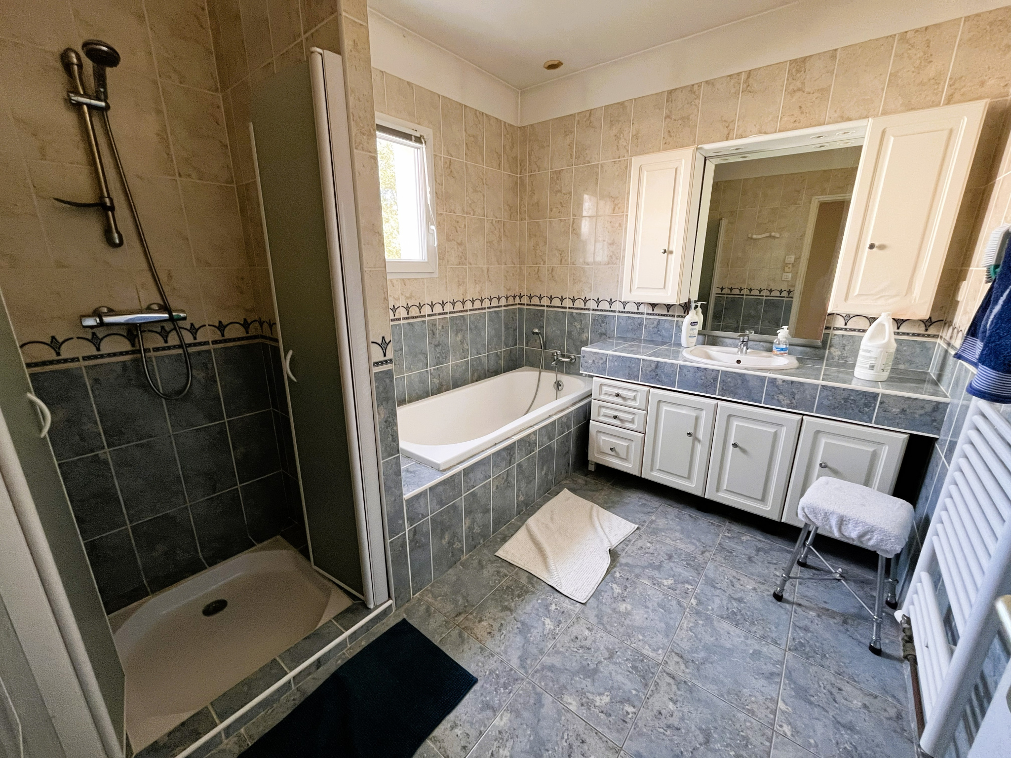 Le rez-de-chaussée propose une suite parentale d’environ 30 m², comprenant une chambre, un dressing indépendant, une salle de bains avec douche et baignoire, ainsi que des sanitaires séparés.
