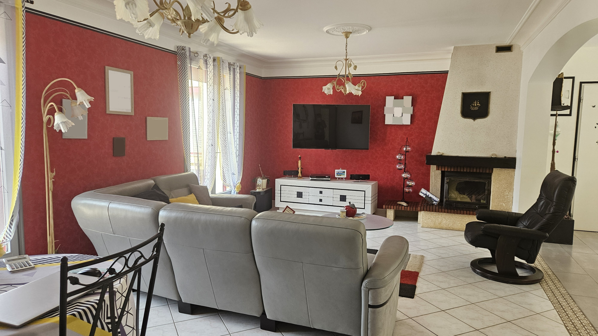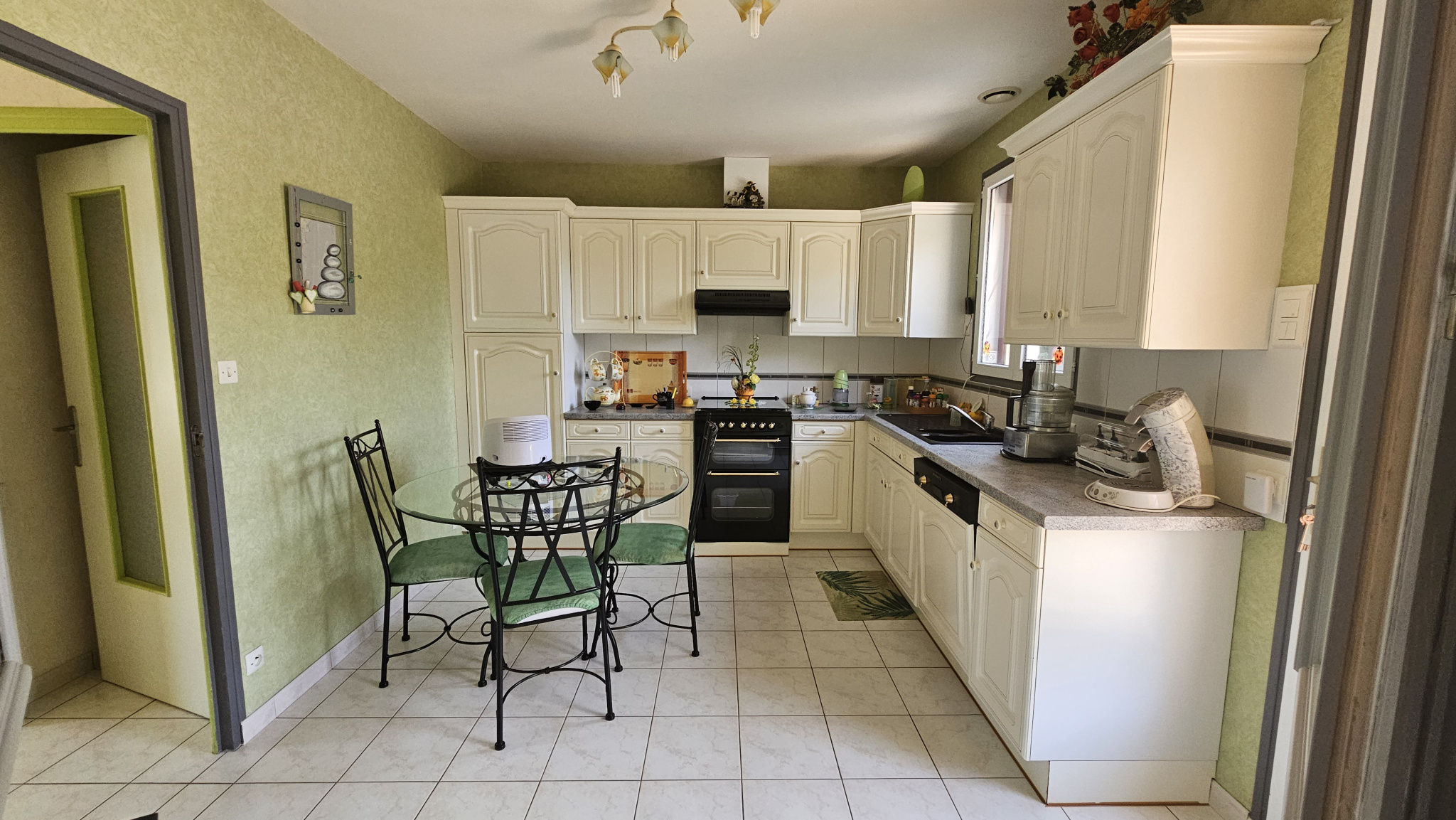 Dès l’arrivée, un hall accueillant mène vers une vaste cuisine aménagée et équipée, idéale pour partager des moments conviviaux, tandis que le salon chaleureux avec cheminée insert et répartiteur de chaleur invite à la détente en toutes saisons
